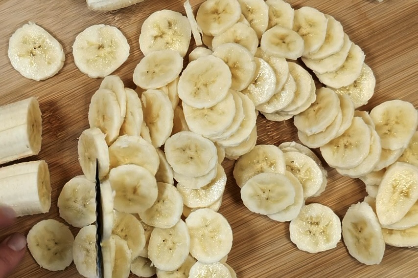 Kopā ar krēmu mēs izmantosim parastos banānus. Tie ideāli sader ar karameļu krēmu un piešķir kūkai papildu aromātu. Sagrieziet tos ripiņās (ne pārāk plānās).