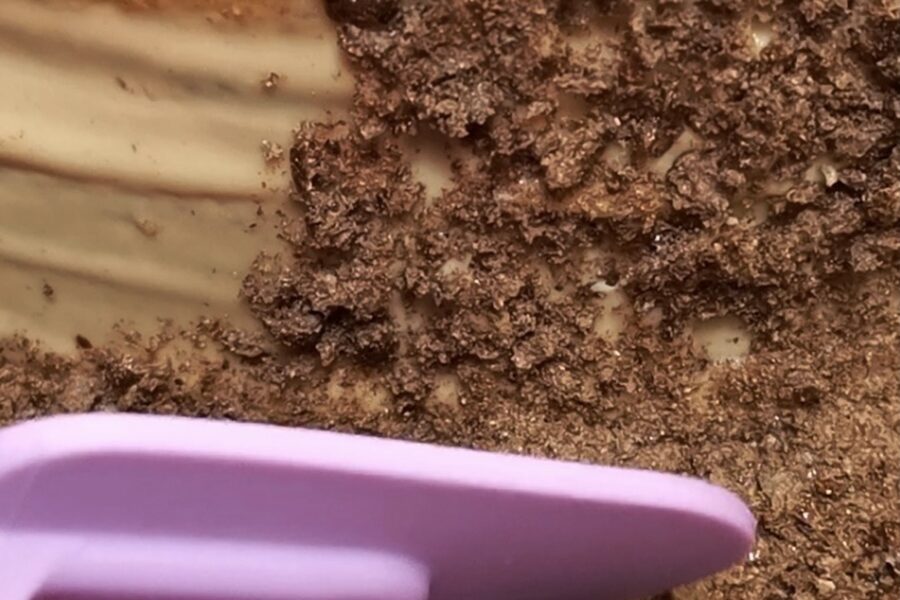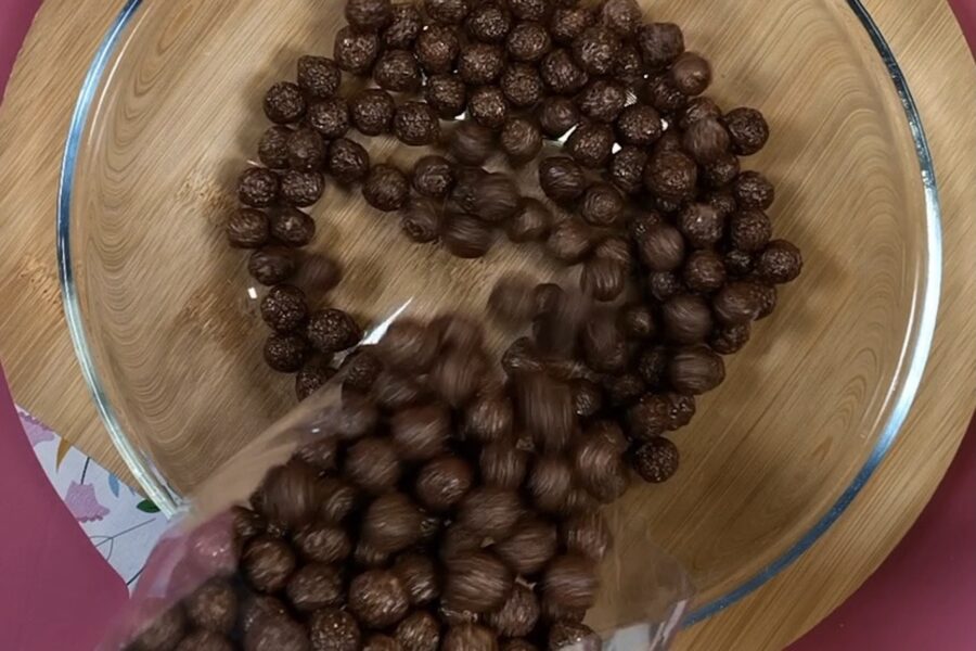 Lai kūka izskatītos “samtaina” un restorāna līmenī, izmantosim vienkāršu viltību – šokolādes brokastu pārslas (bumbiņas).