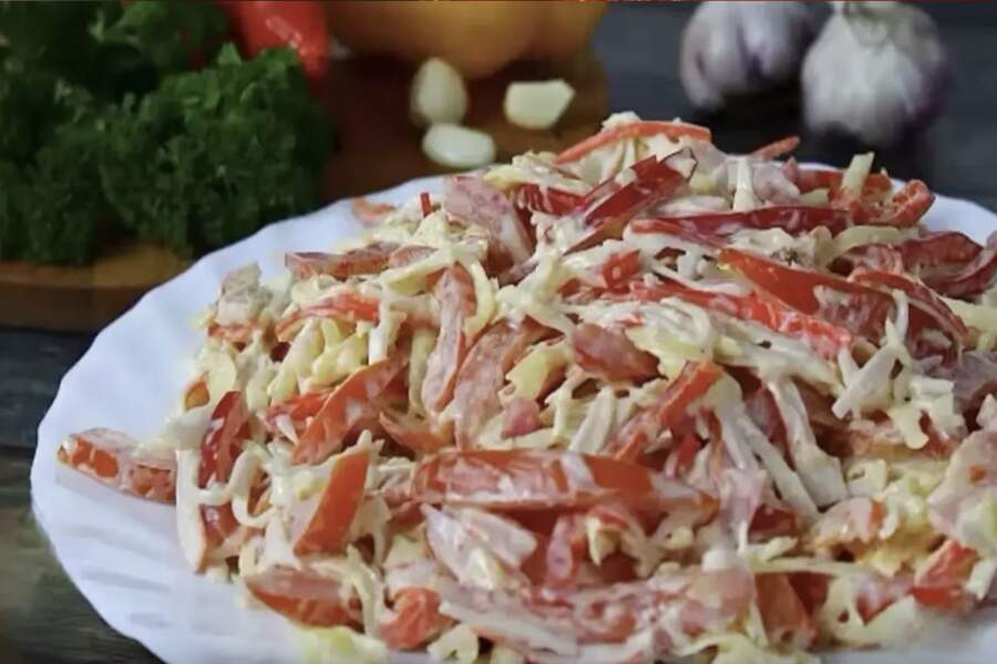 Sāciet ar dārzeņu sagatavošanu. Kad tomāti ir atbrīvoti no liekā šķidruma un sagriezti, pievienojiet tiem smalcinātas krabju nūjiņas. Šajā posmā traukā nonāk arī sarīvētais siers. Svarīga sastāvdaļa ir ķiploks – pietiek ar pāris daiviņām, lai piešķirtu ēdienam raksturu un patīkamu aromātu. Ķiploku vislabāk ir izspiest caur presi vai ļoti smalki sakapāt, lai tas neatstātu pārāk asus akcentus.