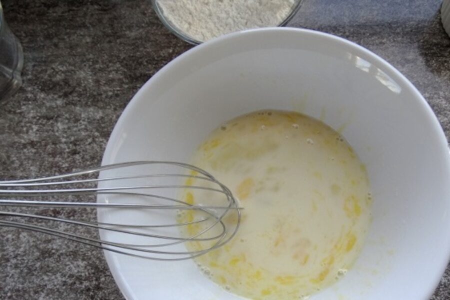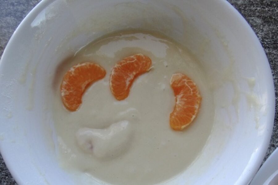 Es izmantoju parastu kviešu miltu un piena maisījumu ar olu. Galvenais ir sakult visu tā, lai nepaliek neviena miltu kunkulīša. Es parasti mīklu taisu tik biezu, lai tajā iemērkta karote būtu pilnībā noklāta un masa lēnām tecētu lejā. Tad es zinu, ka uz mandarīna šķēlītes būs kārtīgs “mētelītis”.