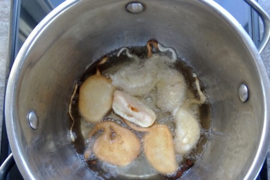 Pannu vajag uzkarsēt pamatīgi, bet ne līdz dūmiem. Es nešmaucis leju eļļu, jo mīklai tajā ir jāsāk “čurkstēt” uzreiz. Ja eļļa būs par aukstu, mīkla to vienkārši sasūksies sevī un deserts būs taukains.