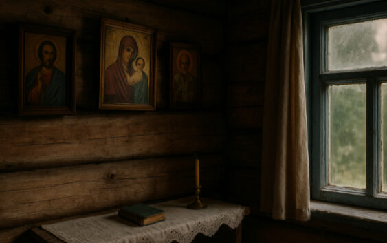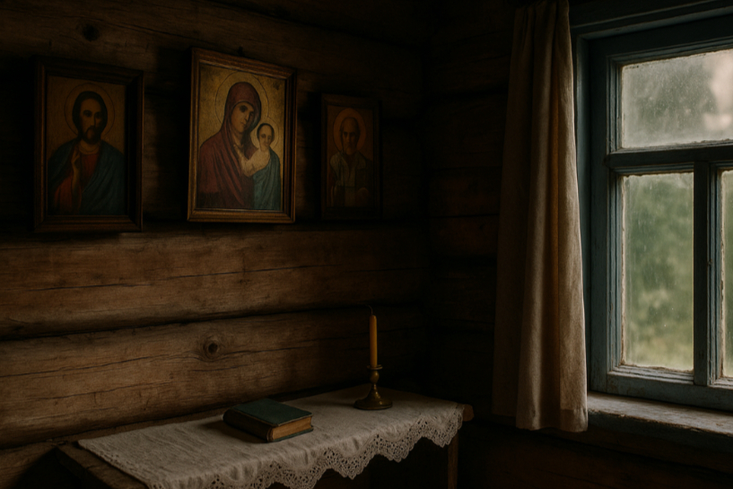 Es iegāju “svētajā stūrī” — mazā vietā lielajā istabā, kur karājās ikonas. To bija daudz. Daļa — zeltītās rāmjos, daļa — vienkāršas, no laika aptumšojušās. Uz plaukta gulēja bieza klade krāsainos vākos, veca svece un salvetīte, ko vecmāmiņa bija izšuvusi vēl pirms vairākiem gadu desmitiem.