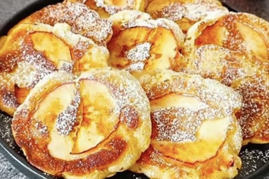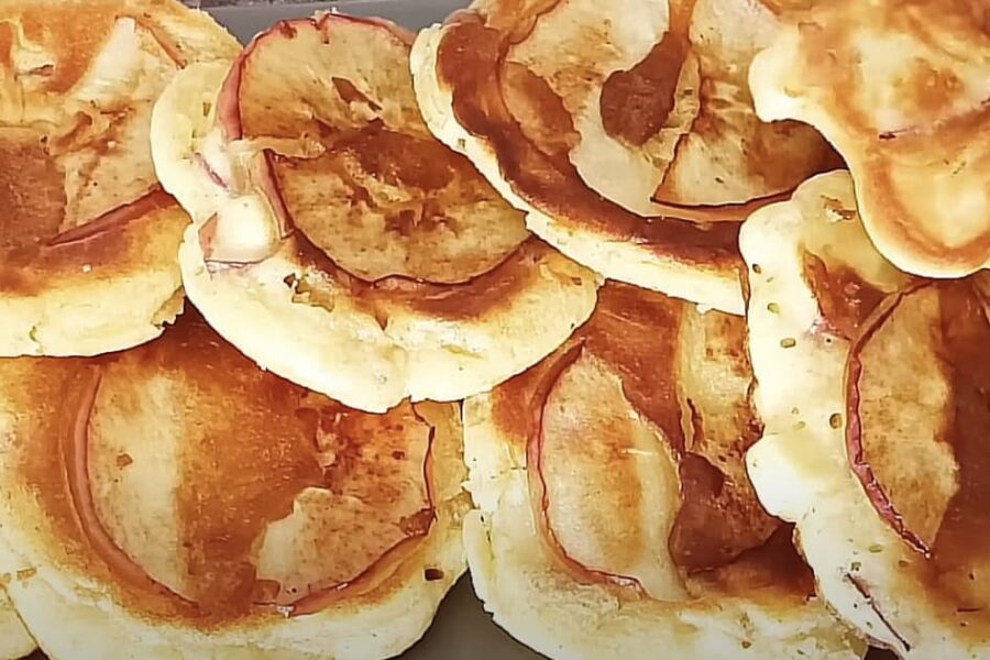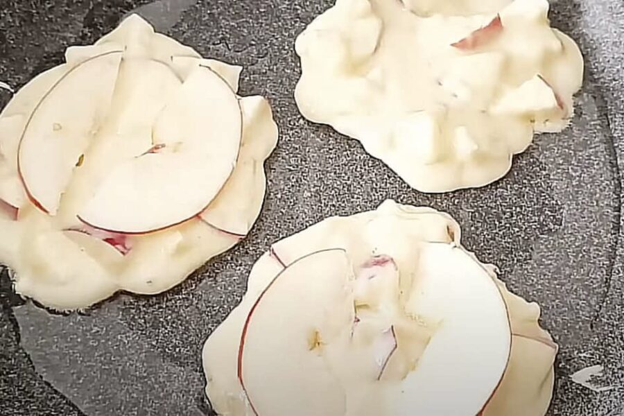Uz sakarsētas pannas, kurā ieliets nedaudz eļļas, ar karoti liek sagatavoto masu. Virsū katrai porcijai uzliek tās ābolu šķēlītes, ko sagriezām sākumā. Pannai uzliek vāku un cep uz vidējas uguns pāris minūtes, līdz apakša kļūst zeltaina. Tad desertu apgriež otrādi un cep vēl brīdi, bet šoreiz bez vāka, lai āboli smuki karamelizētos.