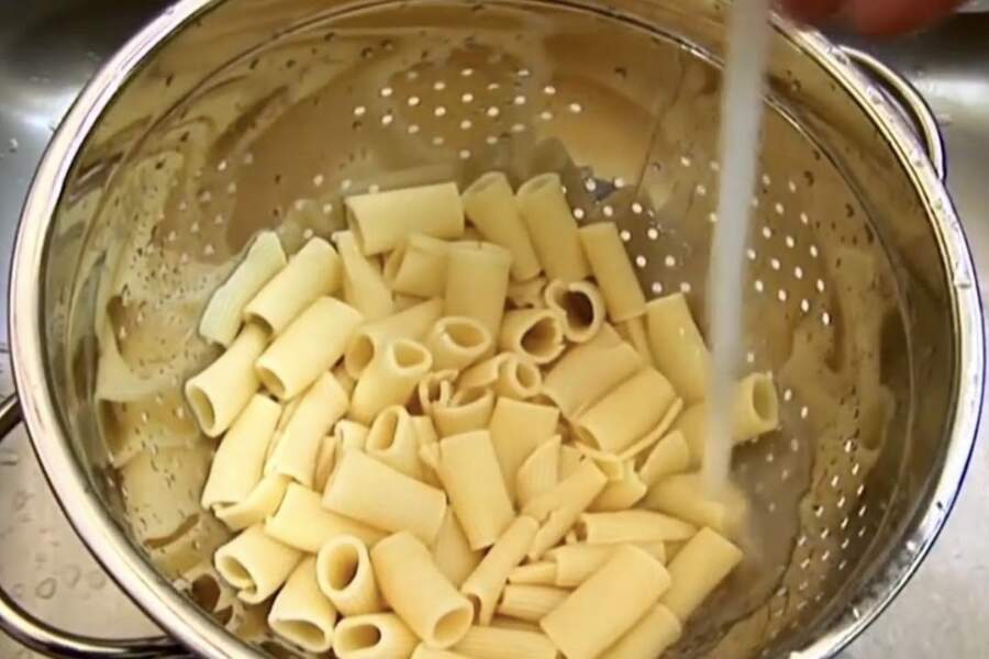 Šis ir paņēmiens, par kuru vēl joprojām daudzi strīdas, taču tas joprojām strādā. Ja makaronus neplānojat uzreiz jaukt kopā ar mērci, tos var noskalot ar aukstu ūdeni. Šis process ātri apstādina vārīšanās procesu un noskalo lieko cieti no makaronu virsmas.