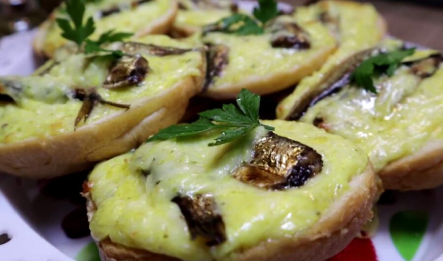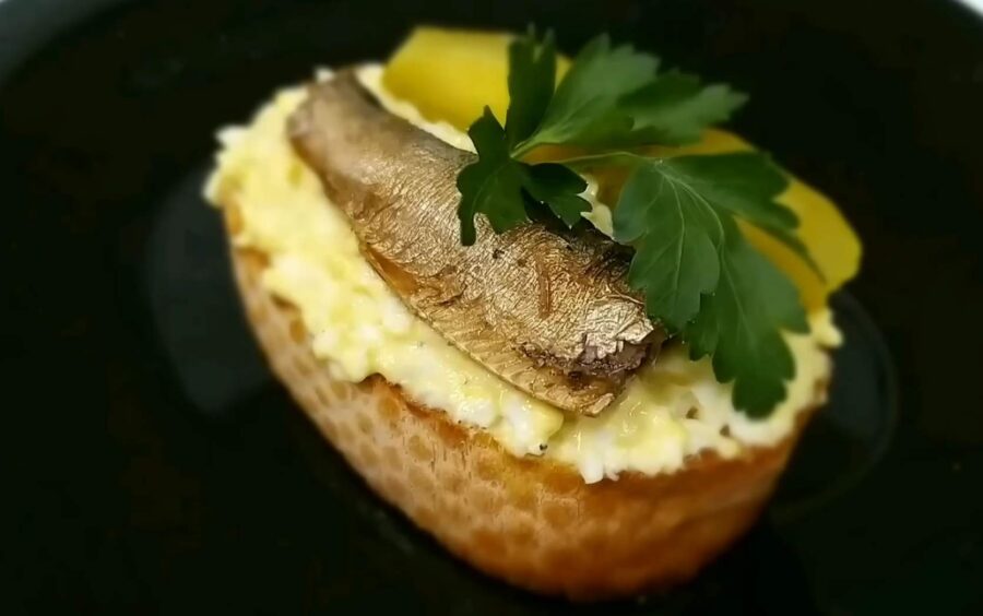4. Tad ņemiet pannā apceptās sviestmaizītes un klājiet virsū šo masu kā sviestu. Nežēlojiet daudzumu! Klājiet bagātīgi. Un, visbeidzot, uzlieciet virsū brētliņas! Katru maizīti vēl varat dekorēt ar sasmalcinātām dillītēm!