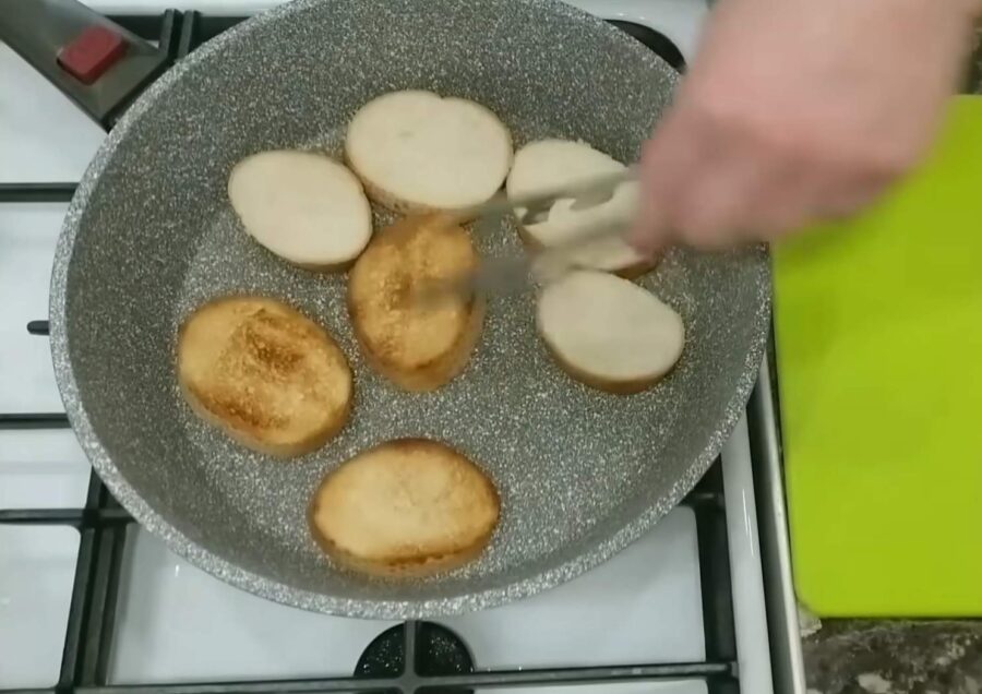 1. Sagrieziet svaigu bageti šķēlītēs. Lieciet šķēlītes grauzdēties iepriekš uzkarsētā pannā no abām pusēm.