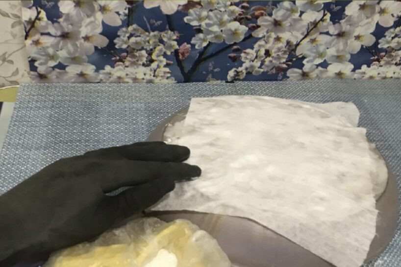Pēc tam paņemam tīru salveti un pārklājam ar to pannu. Uz salvetes arī uzklājam nelielu daudzumu ūdeņraža peroksīda. Atstājam uz 40 minūtēm. Ja šajā laikā pasta sāks izžūt, būs jāpiešķir vēl nedaudz peroksīda.