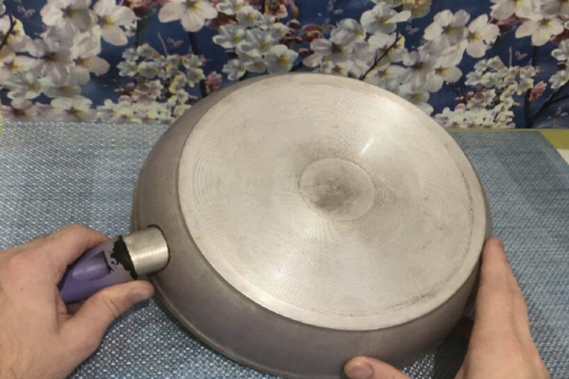 Otrs veids paredzēts pannām ar biezu piedeguma kārtu. Šajā gadījumā rīkojamies līdzīgi, tikai ūdeņraža peroksīda vietā izmantojam amonjaku. Pannu pārklāj ar salveti un ievieto maisiņā. Atstājam uz stundu.