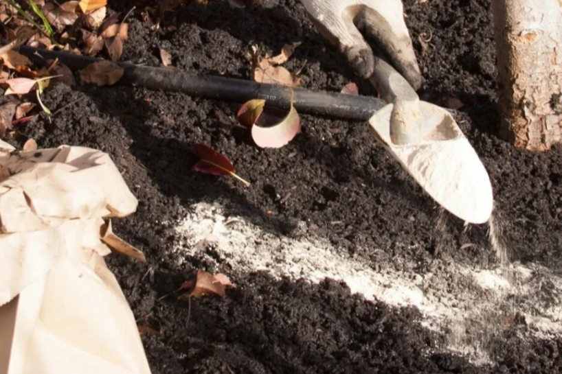 Rīkojieties šādi: plāna pelnu kārta (apmēram 1 ēdamkarote uz m²) — virspusē, tad galvenais maisījuma slānis (2 ēdamkarotes), pēc tam nedaudz spraukumu punktveidīgi pie nākamo stādījumu saknēm (ja pārstādāt). No augšas — viegla lapu mulča. Šāds “slāņainais pīrāgs” ziemā darbojas kā termoss. Pelni virspusē pasargā no izskalošanās, dolomīts vidū koriģē pH, spraukumi apakšā baro, bet kālija sulfāts ir baterijas nākamajiem augļiem.