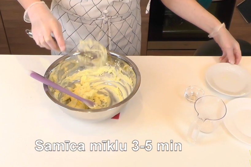 Ja garšo, cukura vietā var pievienot arī kanēli – galvenais neaizmirst šķipsniņu sāls. Ar mikseri visu saputo, līdz masa kļūst viendabīga.