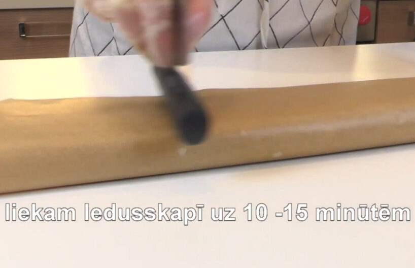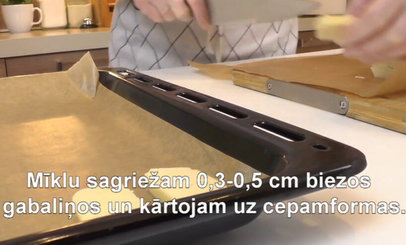 No mīklas izrullē nelielu kārtu un sagriež gabaliņos vai izspiež ar formiņām – forma var būt jebkāda, kā pašam patīk.