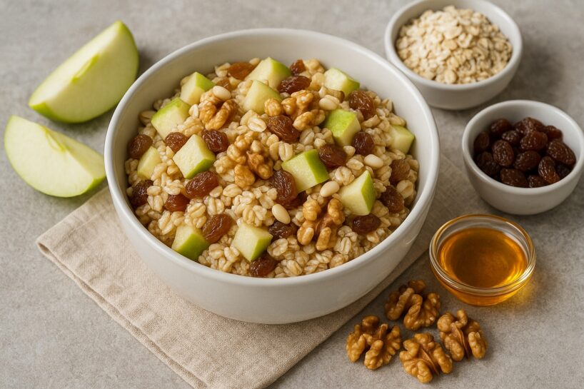 Tvaicējiet pārslas verdošā ūdenī — nevāriet tās, lai saglabātu visas labās īpašības. Izmērcējiet rozīnes ūdenī un nosusiniet, sasmalciniet riekstus un sagrieziet ābolu mazos kubiņos. Visu sajauciet kopā un pievienojiet karoti medus. Lai iegūtu nedaudz papildu garšas, pārkaisiet ar priežu riekstiem.