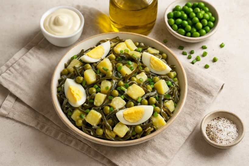 Novāriet kartupeļus un olas, atdzesējiet un sagrieziet kubiņos. Sīki sakapājiet sīpolu. Visu šo labumu sajauciet ar jūras aļģēm un zirnīšiem. Un tad pienāk patiesības brīdis – mērce. Ja vēlaties kaut ko zemniecisku, izmantojiet aromātisku saulespuķu eļļu, kas smaržo pēc tikko pirktas tirgū. Ja vēlaties kaut ko sātīgāku, izmantojiet majonēzi. Tas ir budžetam draudzīgi, sātīgi un ātri pagatavojami. Jums nebūs kauns tos pasniegt.