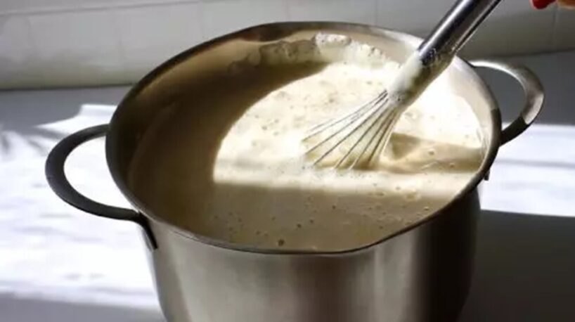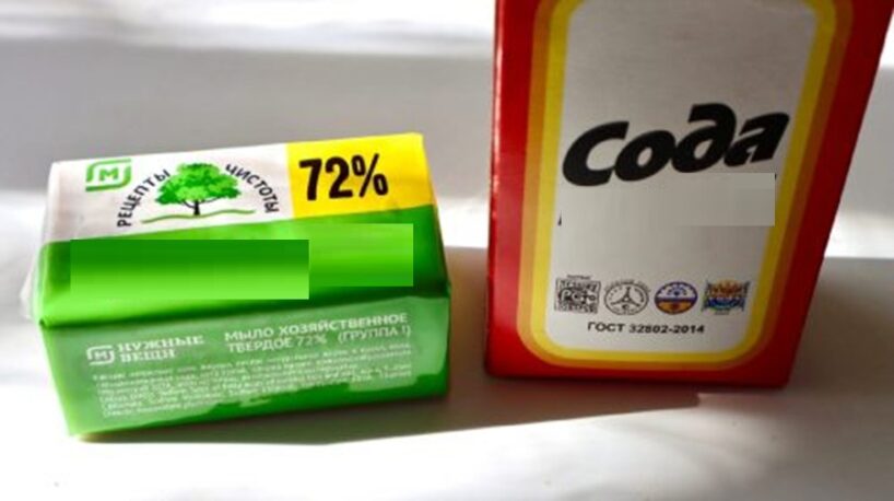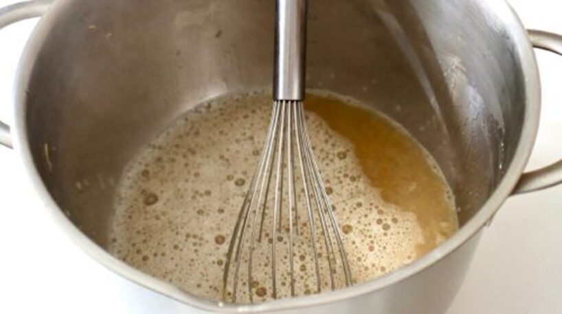 Ievietojam sarīvētās ziepes sešu litru katliņā un pievienojam vienu litru verdoša ūdens.