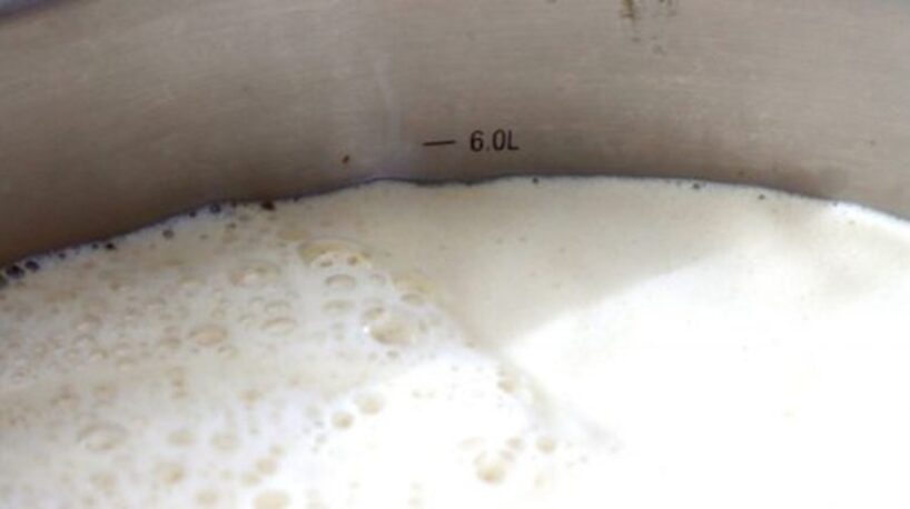 Tagad pievienojam piecus litrus silta ūdens, samaisām un atstājam produktu pilnībā atdzist.
