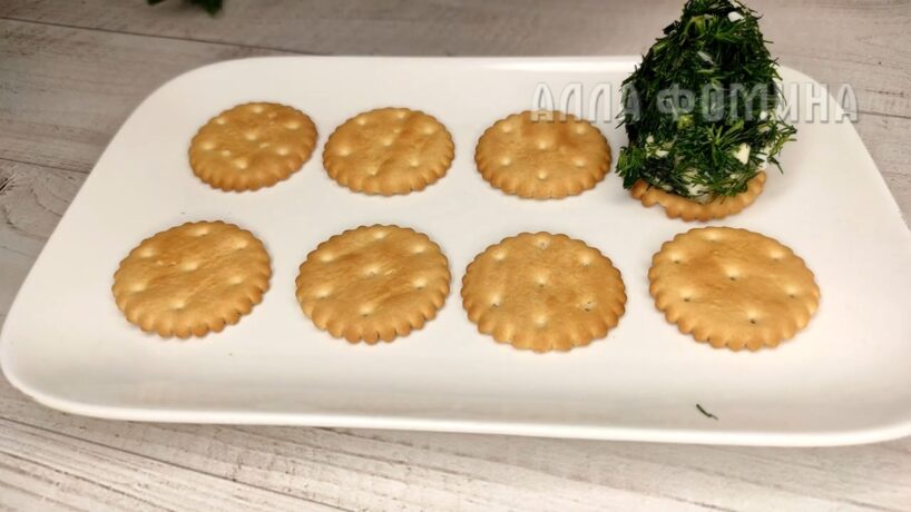 Novieto krekerus uz skaista šķīvja. Izmanto sālītus krekerus. Rūpīgi nomazgājiet un nosusiniet dilles un smalki sakapājiet. Tagad sāksim veidot Ziemassvētku eglītes. Lai to izdarītu, ar ēdamkaroti paņemiet nelielu daudzumu pildījuma un ievietojiet to plaukstā.