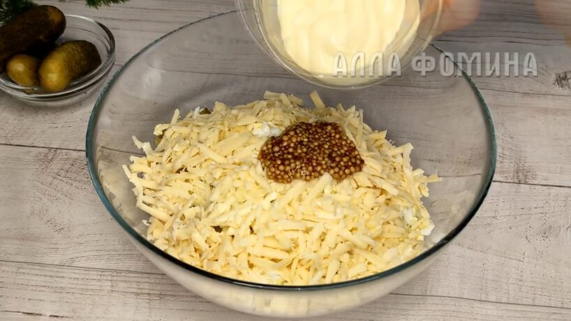 Sarīvē jebkuru cieto sieru uz rupjās rīves. Cietā siera vietā var izmantot kausēto sieru. Ievieto sarīvēto sieru bļodā ar pārējām sastāvdaļām. Tagad pievieno franču graudu sinepes un majonēzi. Visu rūpīgi samaisa, un uzkodu pamatne ir gatava.