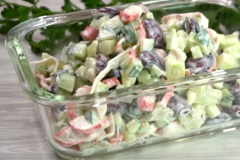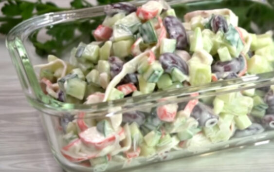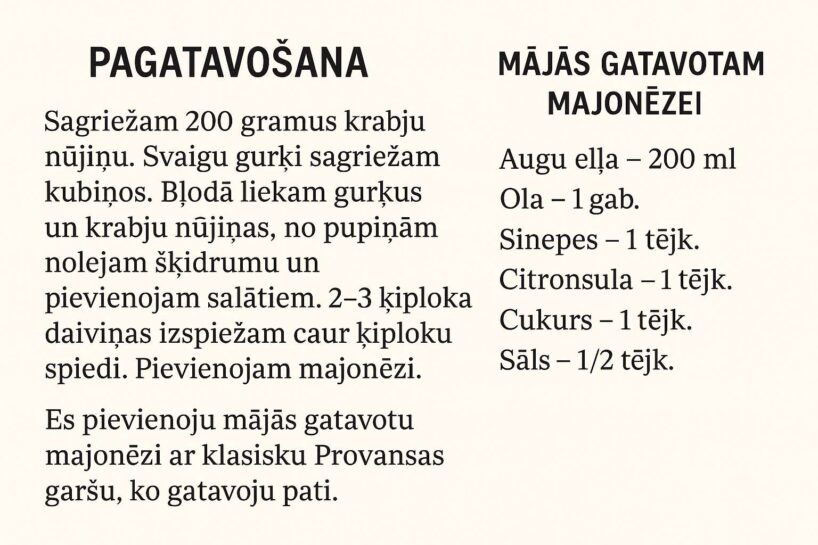 Šie ātrie un garšīgie salāti ir īsts atradums tiem, kuri novērtē savu laiku, bet nevēlas atteikties no garšas. Maigā krabju nūjiņu garša, gurķu kraukšķīgums un ķiploku pikantums, viss kopā ar mājās gatavotu majonēzi rada neatkārtojamu garšu. Gatavojiet ar prieku un baudiet! Precīzas sastāvdaļas atradīsi teksta beigās.