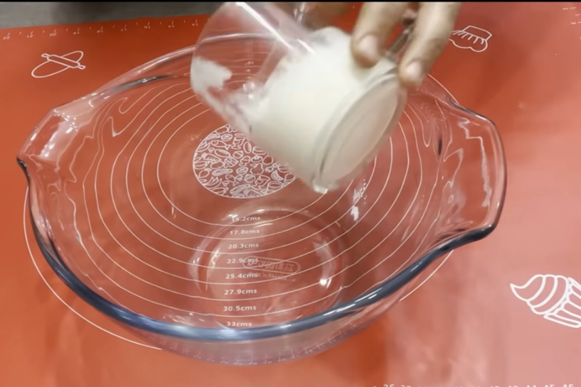 Precīzas sastāvdaļas atradīsi raksta beigās. Sākumā es bļodā ieleju kefīru, paniņas vai neitrālu jogurtu — jebkuru skābpiena produktu. Pie tam es pievienoju vienu glāzi piena. Visiem produktiem jābūt istabas temperatūrā. Nedaudz tā visu samaisu. Pievienoju arī sāli. Pielieku cepamo pulveri.