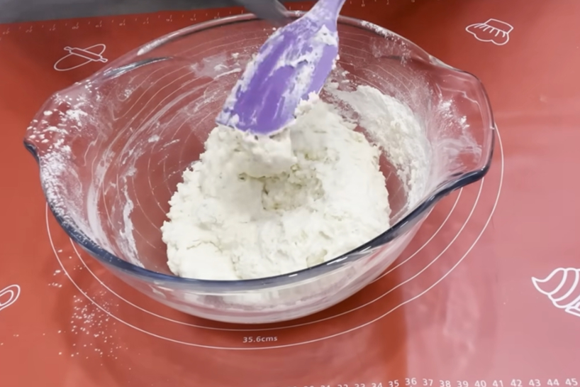 Un miltus pievienosim pakāpeniski. Tā ir pavisam vienkārša mīkla — bez sviesta un bez olām. Šodien mēs to gatavosim. Vispirms es to samaisu ar lāpstiņu.