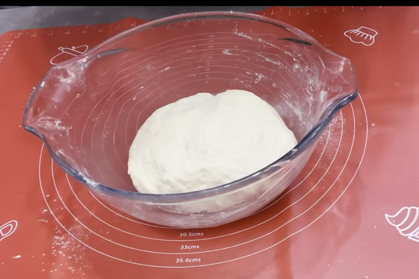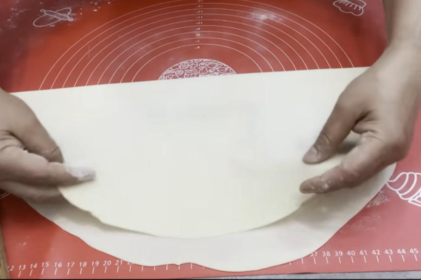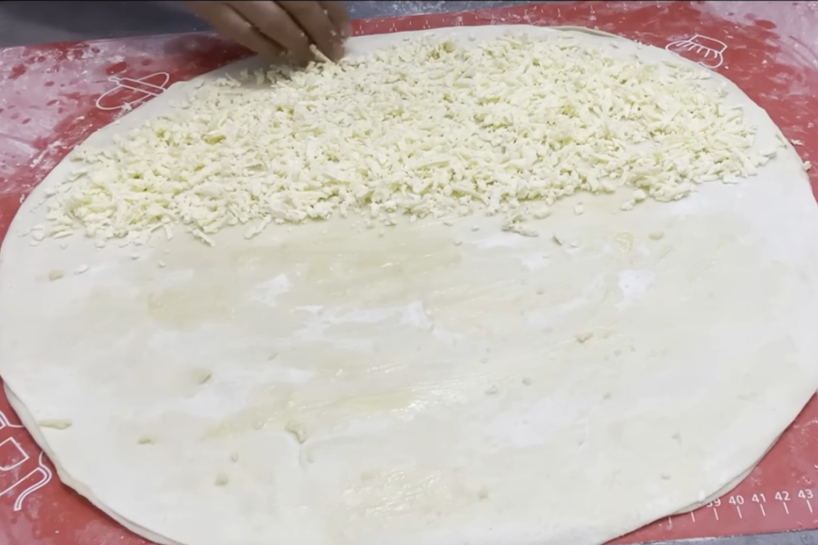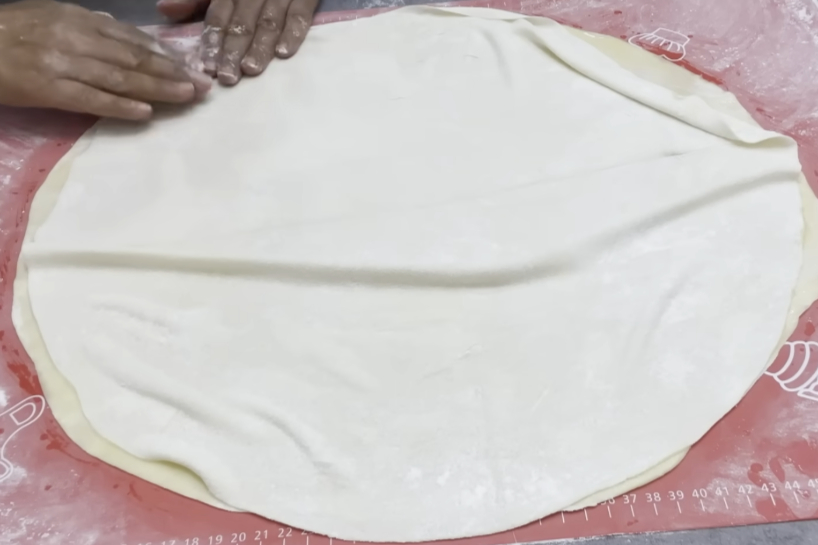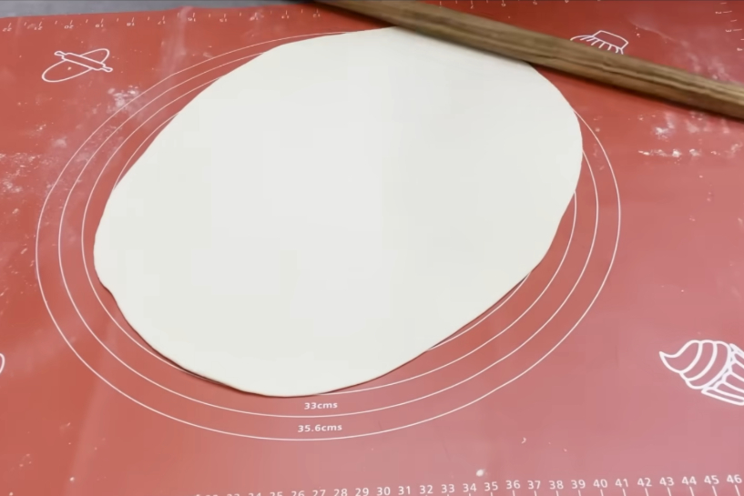 Lūk, šādi izskatās mūsu sagatave. Nedaudz pārkaisu ar miltiem un sāku rullēt — vispirms ar rokām nedaudz piespiežu, pēc tam ar rulli viegli izrullēju. Skaistums, kas mums sanācis! Tagad šo sagatavi pārceļam uz cepešpannu, kas iepriekš ieziesta ar augu eļļu.