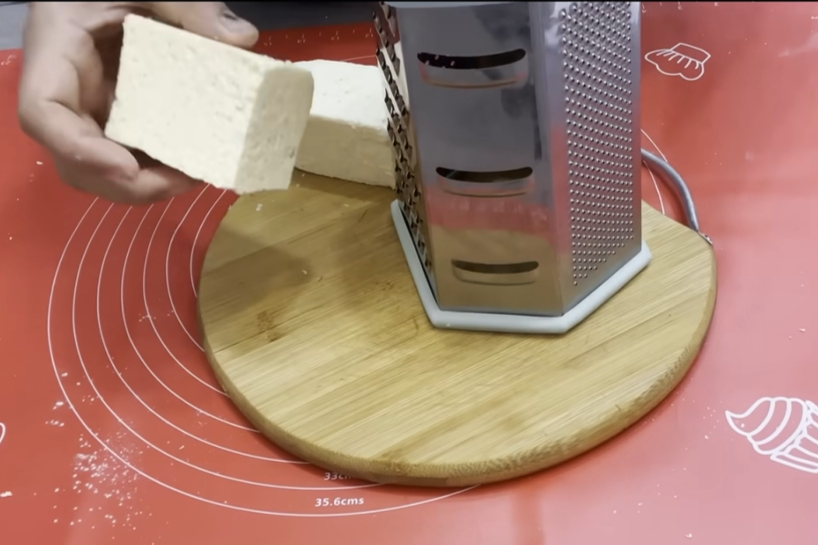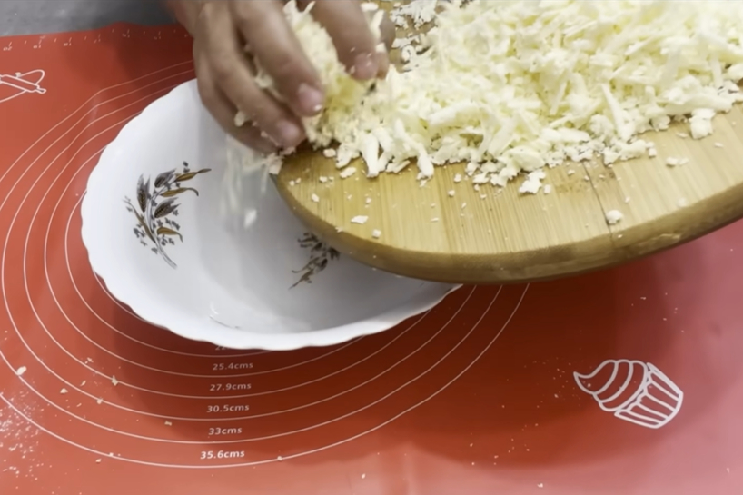 Pildījumam es paņēmu divus gabalus siera, kurus sarīvēju uz rupjās rīves. Ja jums siers ir ļoti sāļš, to var sajaukt ar biezpienu. Man siers nav pārāk sāļš, tāpēc visu sarīvēju.