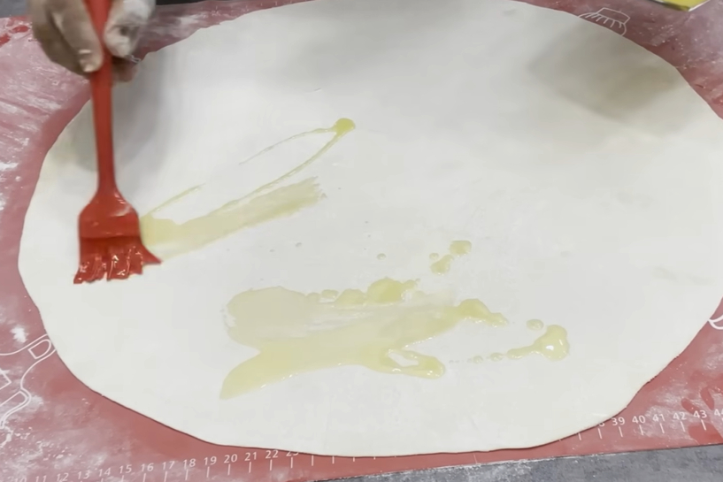 Tagad paskatieties — kad esmu tos izrullējusi, es lieko cieti viegli nopurinu, un katru slāni atliek malā. Pirmo slāni atstāju uz galda un sākam veidot mūsu cepumu. Lūk, es izliku pirmo mīklas kārtu, un tagad plānā kārtā izsmērēju eļļas maisījumu.