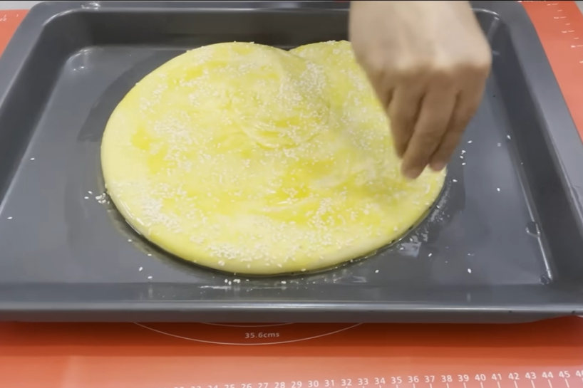 Tagad uzlieku virsū otro mīklas kārtu. Ar rokām to viegli pievienoju iepriekšējā slāņa izmēram, pielāgoju. Pārsmērēju ar eļļas maisījumu.