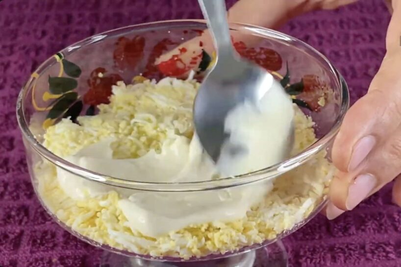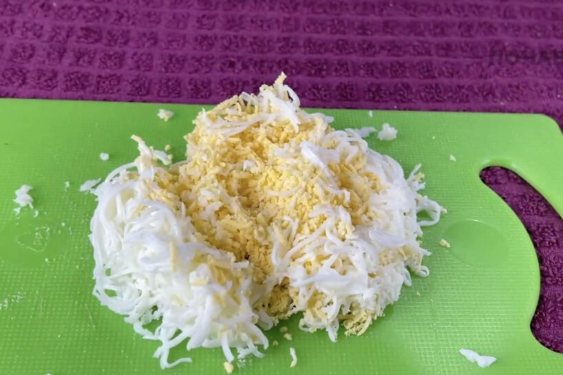 Sarīvētas vārītas olas uz rupjās rīves padara slāni maigu un gaisīgu. Šis slānis palīdz salātiem kļūt sātīgiem, bet ne smagiem.