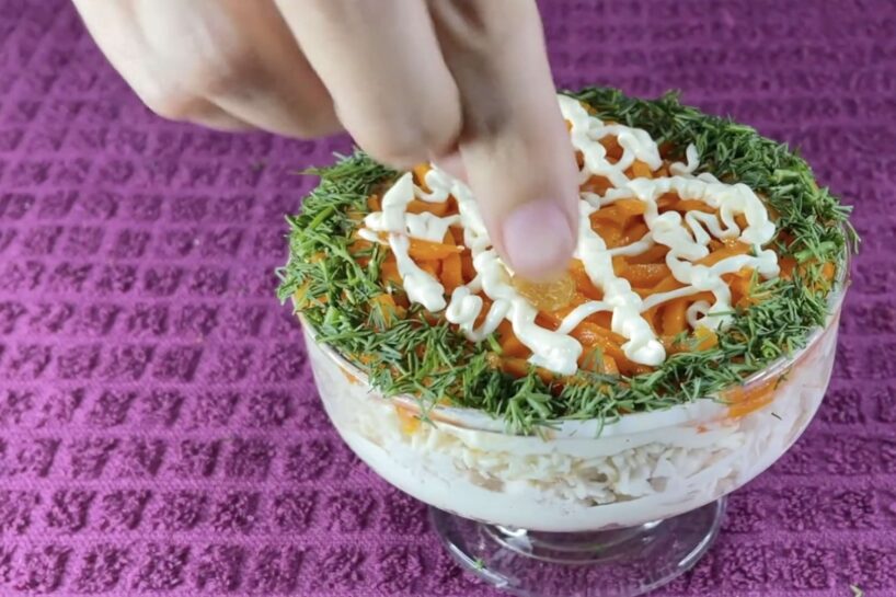 Eleganti, sātīgi un neticami gardi salāti “Napoleons”, kurus svētkos vienmēr apēd pirmos.