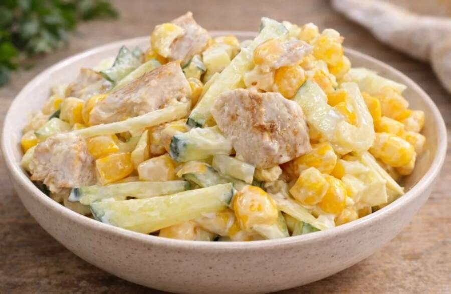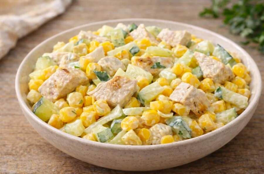 Gurķi vislabāk griezt nelielos stabiņos jeb “bumbiņās” – tā tie salātos būs pamanāmāki un nezaudēs savu kraukšķīgo tekstūru. Visu liek bļodā, pievieno konservētu kukurūzu, pieber šķipsniņu sāls un pievieno ēdamkaroti majonēzes.