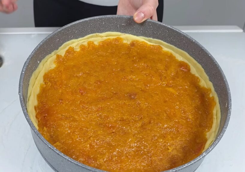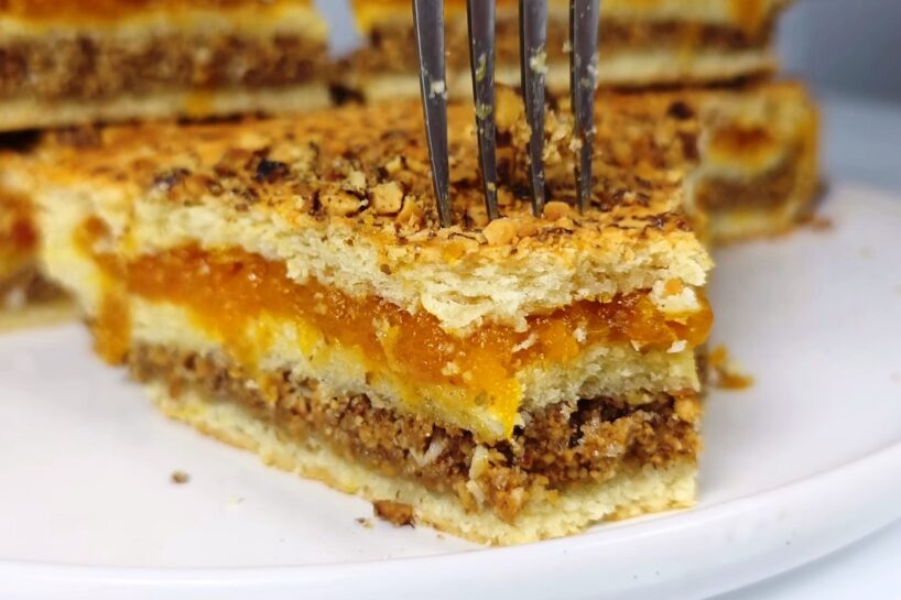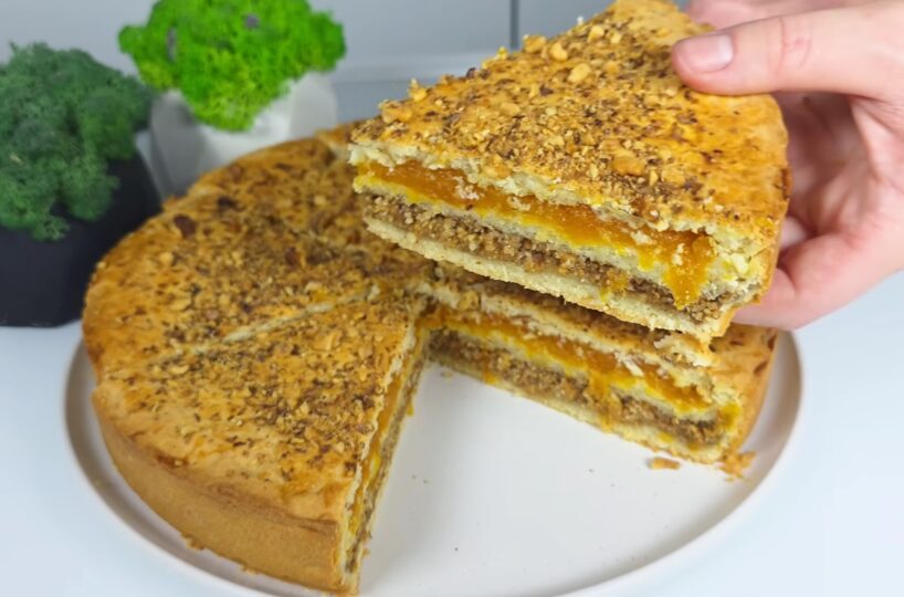 Pirmais slānis ir riekstu pildījums — to vienmērīgi izklāju un nedaudz piespiežu. Tad izrullu otro mīklas daļu un pārklāju riekstus. Otrā kārtā lieku aprikožu pildījumu — tas dod patīkamu saldenu skābumiņu un padara pīrāgu sulīgu.