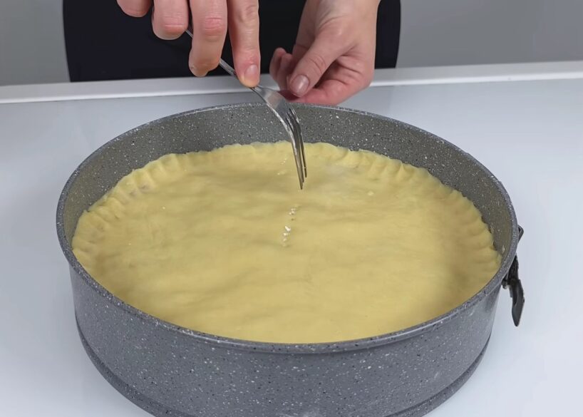 Kad mīkla ir atpūtusies, to sadalu trīs daļās: vienu lielāku un divas mazākas. Lielo mīklas daļu izrullu un ielieku kūkas formā — tā, lai veidojas dibens un mazliet pacelti maliņas. Apakšu saduru ar dakšiņu, lai cepot neveidojas gaisa burbuļi.