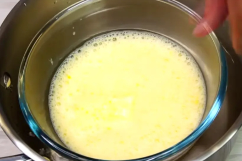 Katlā ielejam ūdeni, virs tā novietojam bļodu ar olu masu, aizveram ar vāku un uzliekam uz uguns. No brīža, kad ūdens sāk vārīties, skaitām 15–20 minūtes līdz pilnai gatavībai.