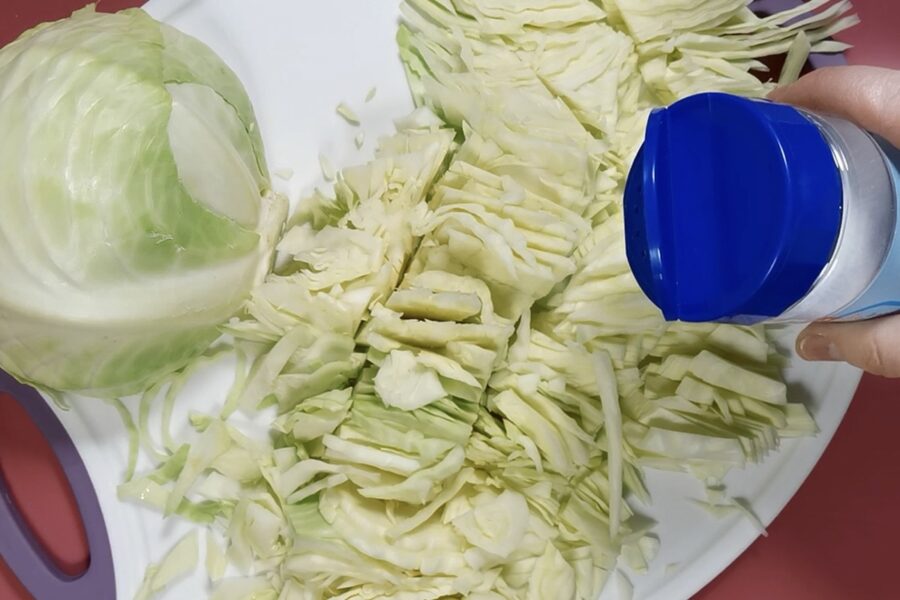Galvenā sastāvdaļa mums ir kāposts. Tāpēc ar to arī sāksim. Kāpostu sašķērējam smalkās strēmelēs, kā ierasts soļankai. Ieliekam tos lielā bļodā, uzkaisām sāli un ar rokām nedaudz pamaicām. Tas palīdz kāpostiem kļūt mīkstākiem un sākt atdot sulu vēl pirms karstumapstrādes.