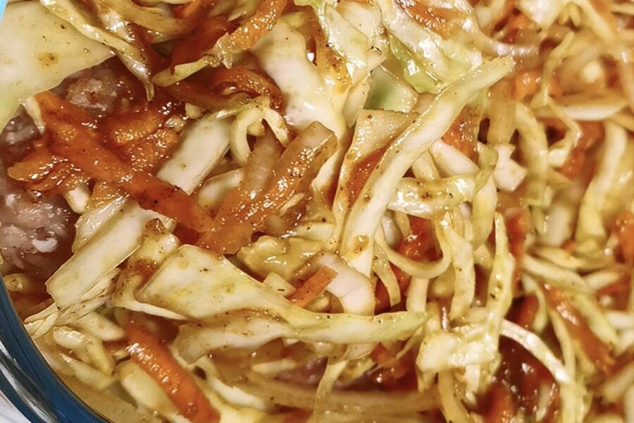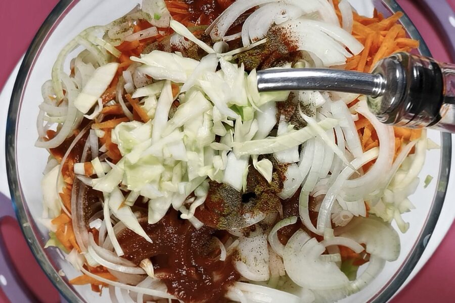 Bļodā pie kāpostiem pievienojam uz rupjas rīves sarīvētus burkānus un sīpolus. Sīpolus labāk griezt pusgredzenos vai ceturtdaļās, lai tie būtu jūtami. Pievienojam garšvielas – saldo papriku un kariju. Karijs piešķirs ne tikai interesantu garšas niansi, bet arī skaistu, zeltainu toni. Pielejam nedaudz augu eļļas un ūdenī atšķaidītu tomātu pastu. Visu rūpīgi samaisām un pagaidām noliekam malā, lai garšas “sadraudzējas”.