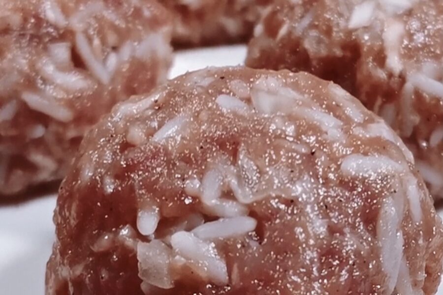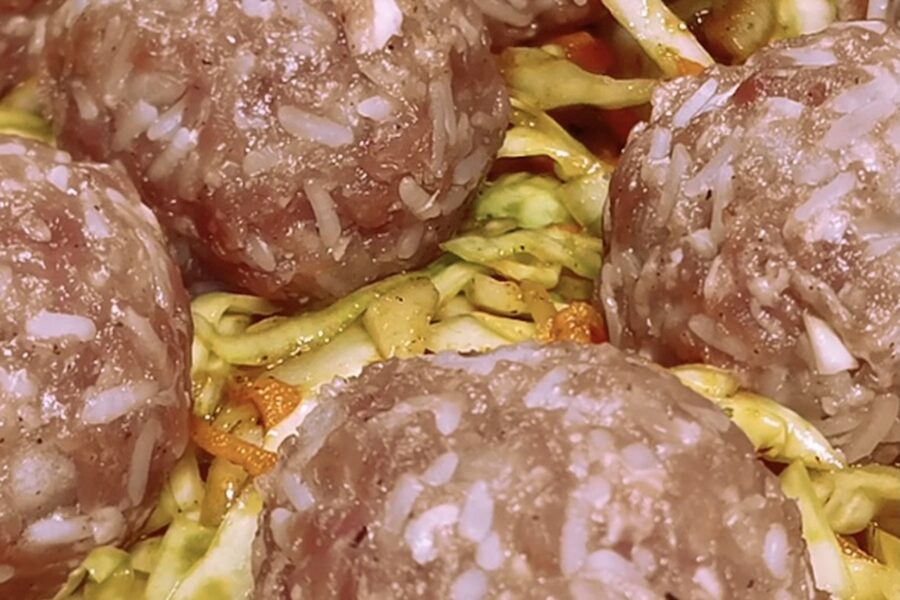 Nākamais solis ir gaļas bumbiņas jeb teftelīši. Es izmantoju jebkuru malto gaļu, kas mājās ir pieejama. Svarīgi ir rīsi – es tos nevāru. Es tos vienkārši apleju ar verdošu ūdeni un ļauju 10 minūtes pastāvēt. Ar to pilnīgi pietiek, lai krāsnī tie izceptos ideāli un nebūtu cieti.