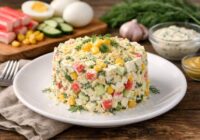Viegli un tajā pašā laikā sātīgi salāti no krabju nūjiņām, olām, gurķa un saldās kukurūzas, ko papildina pikanta mājas mērce no rīvēta siera, ķiploka, dilles, sinepēm un majonēzes