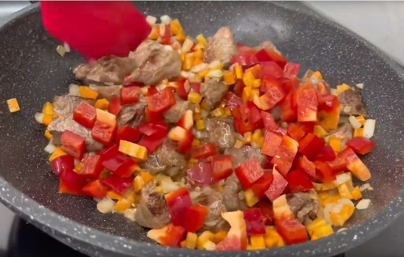 Dārzeņu pievienošana: Pievienojiet sīpolu un burkānu, apcepiet 2-3 minūtes. Pēc tam pievienojiet papriku un turpiniet apcept vēl 2 minūtes.