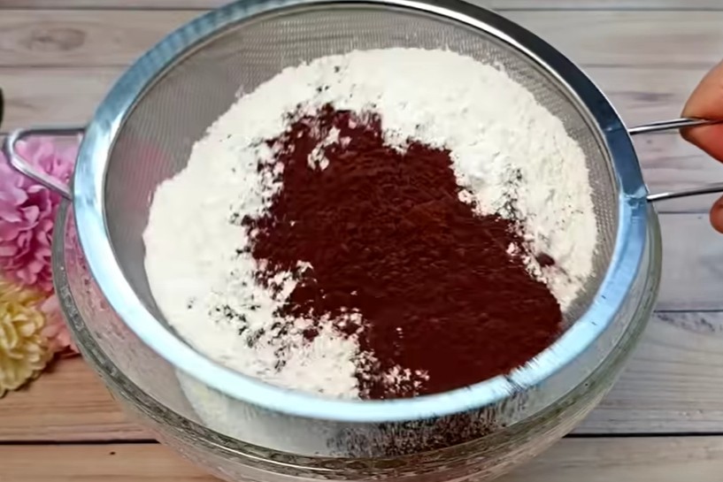 Miltus sajauc kopā ar kakao un cepamo pulveri. Izsijā sakultajā masā