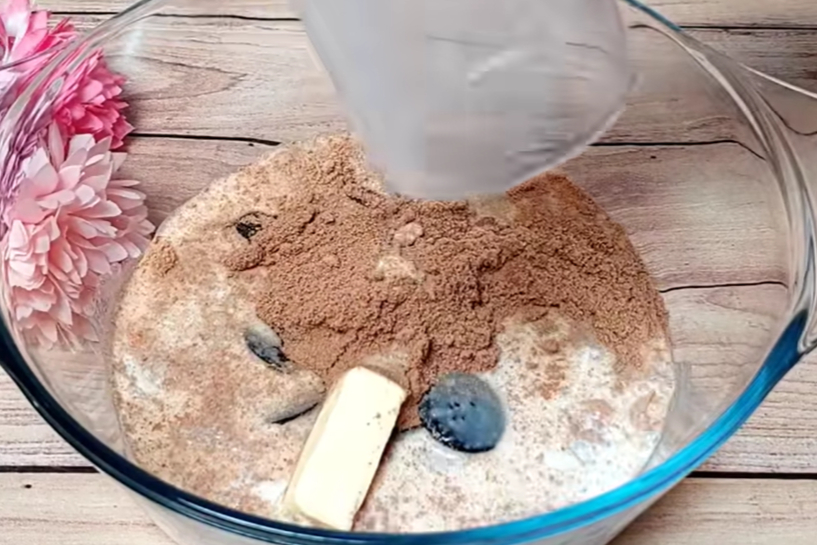 Pielej pienu, kakao, pievienos sviestu un visu kārtīgi samaisa
