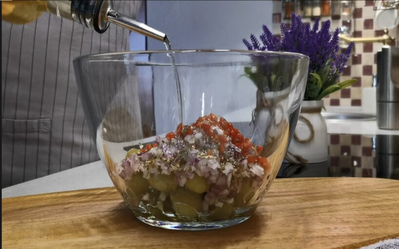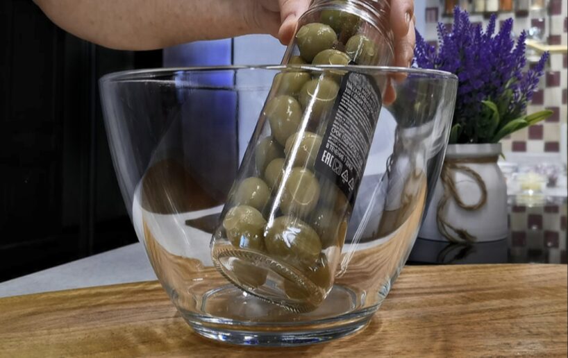 Kas jādara. Ņemam olīvas un nolejam šķidrumu no bundžas. Tas nav vajadzīgs. Pašas olīvas izberam ērtā bļodā.