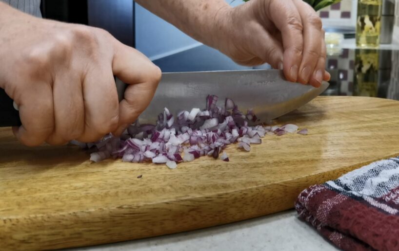 Tagad mums tām jāpievieno dažas lietas. Tās ir trīs pavisam vienkāršas sastāvdaļas. Pirmā sastāvdaļa ir sīpols, vēlams sarkanais. To sasmalcinām tik smalki, cik pietiek pacietības.
