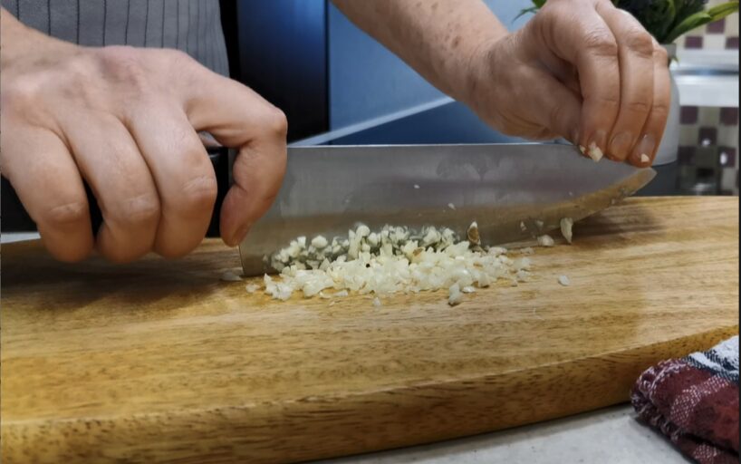 Tālāk otrā sastāvdaļa. Tas ir ķiploks, bet tikai izņēmuma kārtā svaigs, nevis kaltēts. Arī to sakapājam ļoti smalki. Vispār jau mums visam jābūt smalki sagrieztam.