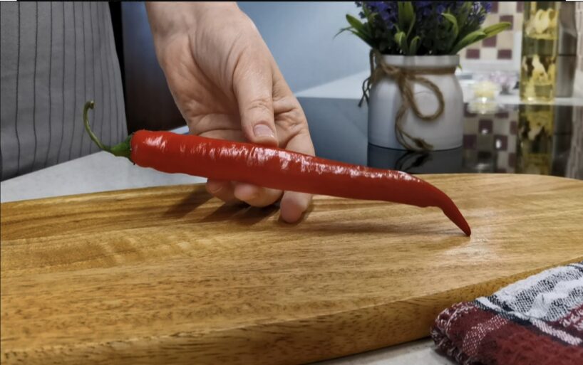 Un trešā sastāvdaļa ir asais čili pipars. To sasmalcinām tieši tāpat. Tikai iepriekš izņemam no tā sēkliņas, citādi būs ļoti ass un neviens to nespēs ēst. Bet nedaudz piparu bez sēkliņām ir pavisam normāli – nav pārāk ass, tieši laikā.