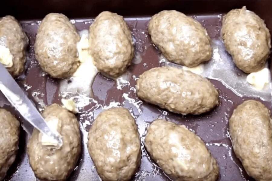 Pēc tam es pannu izvelku ārā un uz katras kotletes uzlieku nelielu gabaliņu sviesta. Sviests izkusīs un iesūksies gaļā, padarot vakariņas karaliskas. Pēc tam lieku atpakaļ krāsnī vēl uz 15 minūtēm. Kad laiks ir pagājis, es kotletes vēlreiz apsmērēju ar to šķidrumu, kas iztecējis uz pannas – tas piešķir skaistu spīdumu.