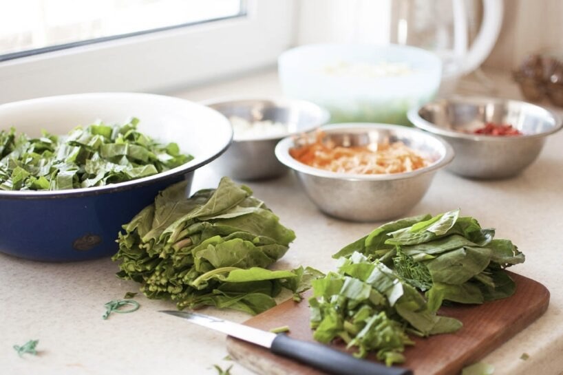 Pievienojiet smalki sagrieztas skābenes un citus zaļumus.