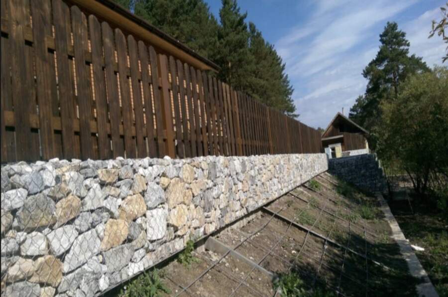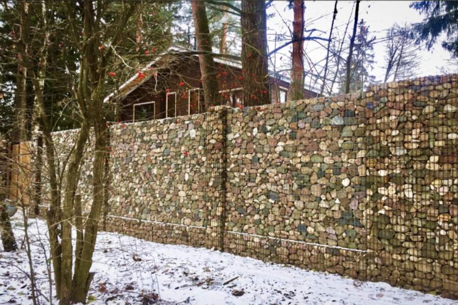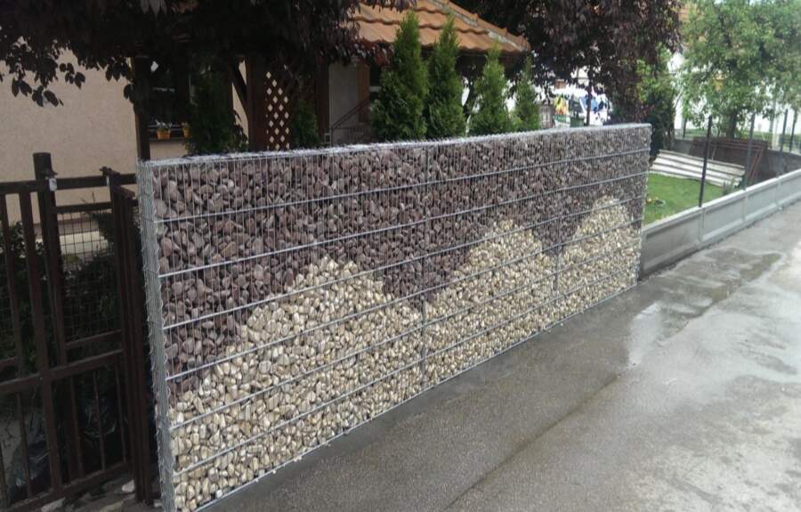 Pamatnes risinājumi: Gabionus var izmantot tikai žoga apakšējā daļā, veidojot stabilu cokolu, kas pasargā konstrukciju no mitruma.