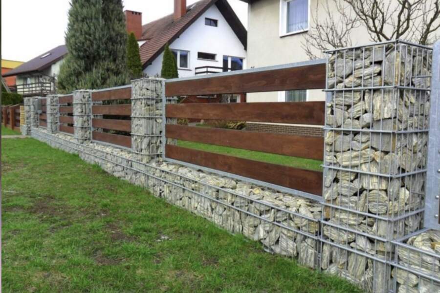 Kombinēšana ar koku: Ļoti gaumīgi izskatās risinājums, kur akmens gabioni kalpo tikai kā nesošie stabi vai pamatne, bet starp tiem tiek ievietoti koka paneļi.