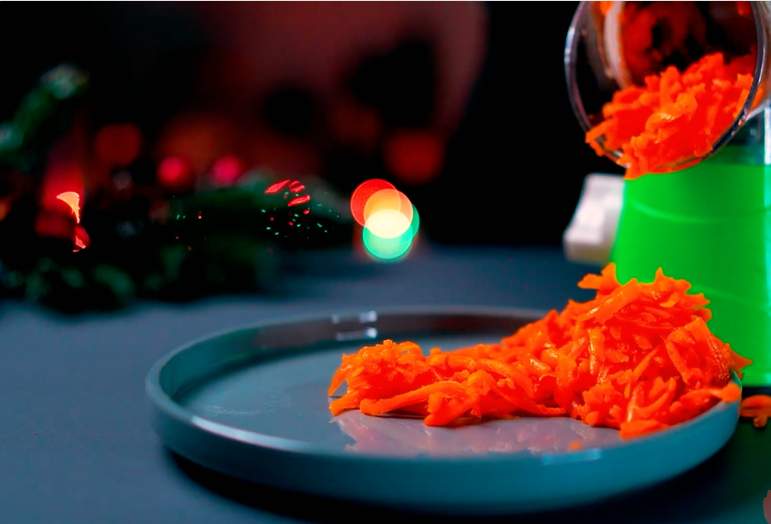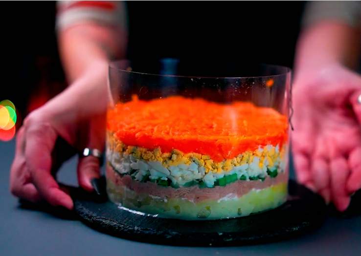 Kā pēdējo slāni klājam burkānus. Izveidojam ideāli gludu virsmu un liekam salātus ledusskapī vismaz uz 30 minūtēm, pirms noņemam formu.